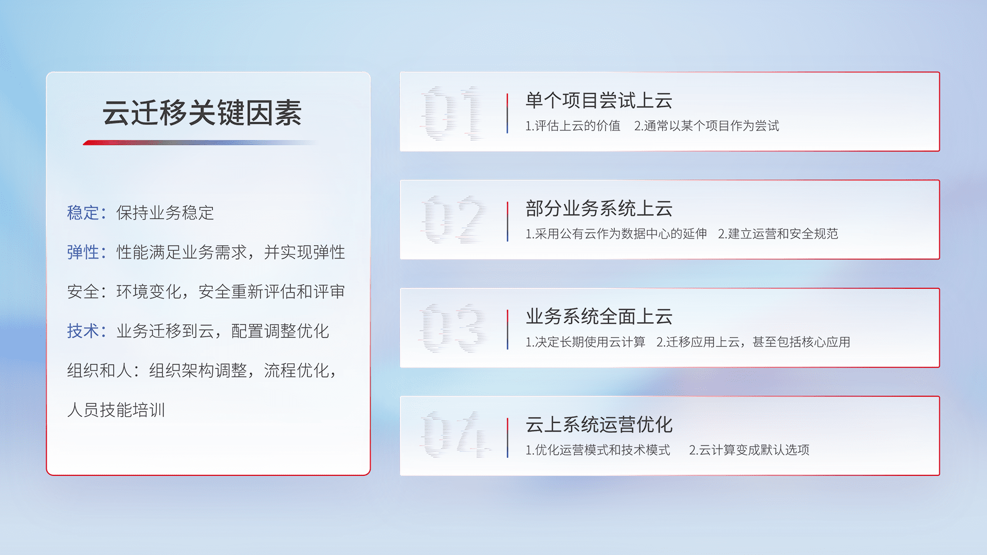 结合实际业务,,从规划设计、、、、云平台选型、、云原生改造、、、、数据迁移、、、集成交付,,,,迁移全过程为客户识别最佳上云路径,,,做好风险识别管理,,,设计网络架构、、身份权限、、安全审计合规、、操作审计、、、、日志审计、、、、监控告警策略、、、、多站点容灾设计等,,对云上基础设施进行整体规划,,,提升IT治理水平,,,,以满足弹性、、高可用、、、、高性能的需求。。。。