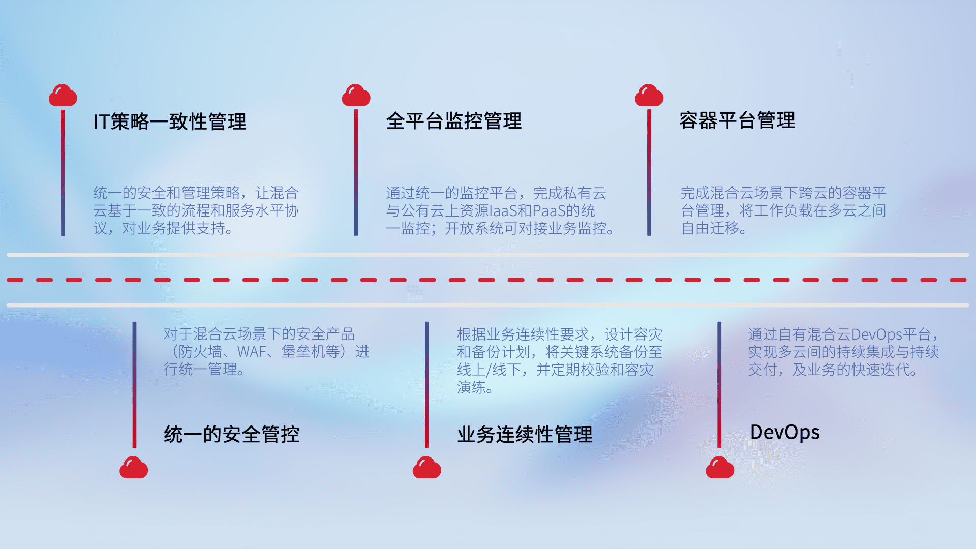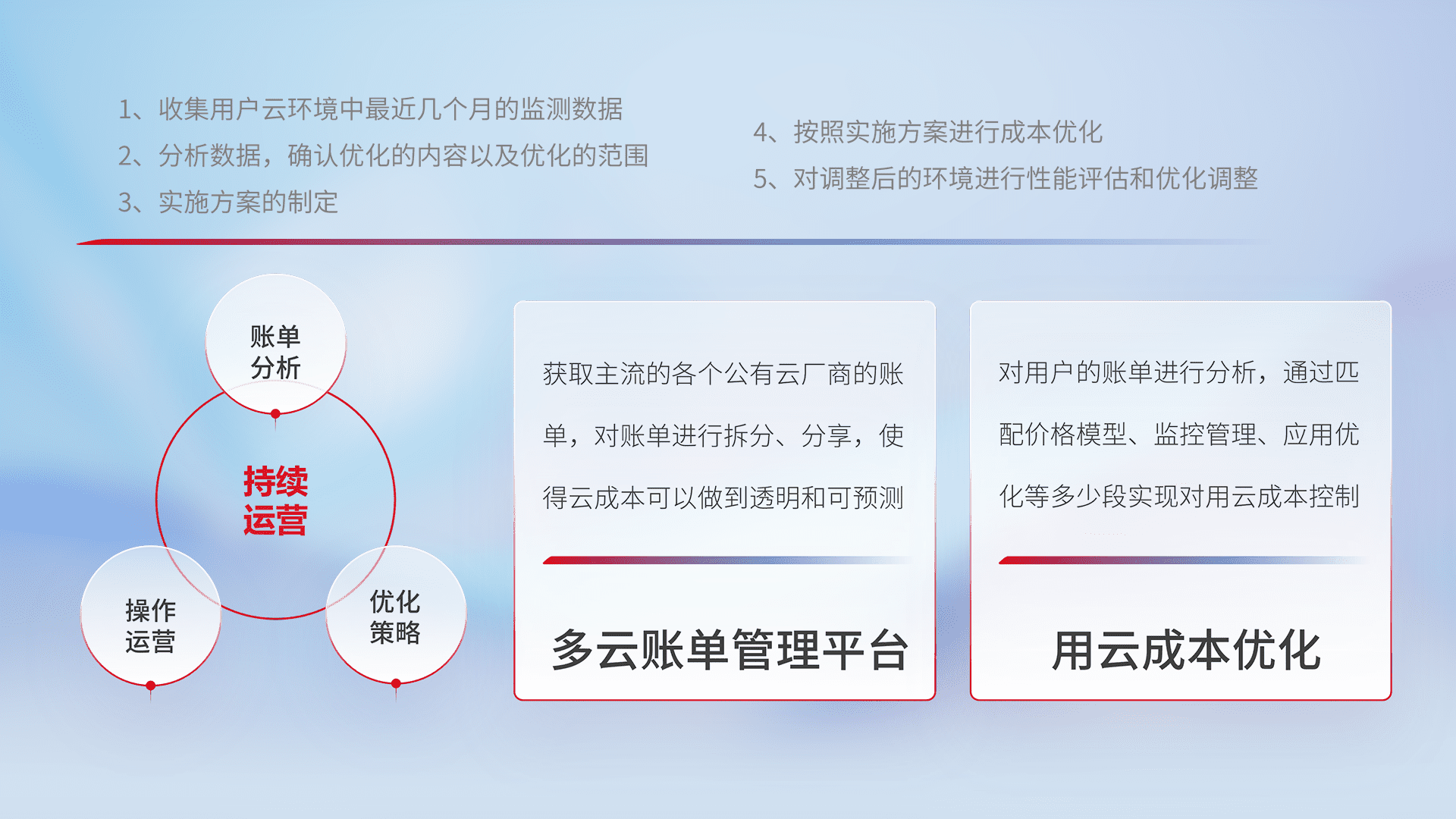 通过多云纳管,,以统一的资源数据模型把客户的云资源进行抽象和封装,,,,进而实现对多云资源的统一操作,,,,保障云资源管理的可靠性、、、、稳定性与可用性。。。。量身定制化运维内容,,,,配置、、、开发运维、、补丁管理、、、备份、、、、监控、、、认证和访问管理、、审计和日常巡检等,,保障在用云过程中的可靠度,,,,稳定度以及高可用率。。